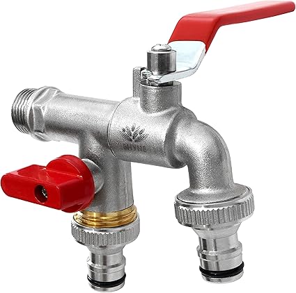 Agora Tec Wasserhahn 1 2 Zoll Ag Mit 3 4 Zoll Abgang Und Zweiten Stecksystemanschluss Vernickelt Zwei Auslaufventile Fur Zwei Gartenschlauche Amazon De Garten