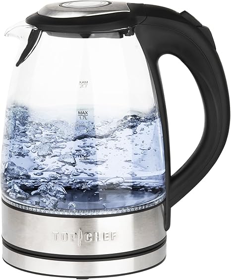 Amazon De Top Chef Topc546 Elektrischer Wasserkocher 1 7 L Glas Sehr Hohe Widerstandsfahigkeit Transparent Wasserstandsanzeige Blaue Led Kompakt Praktisch 2200 W Schnelles Aufheizen Waschbar